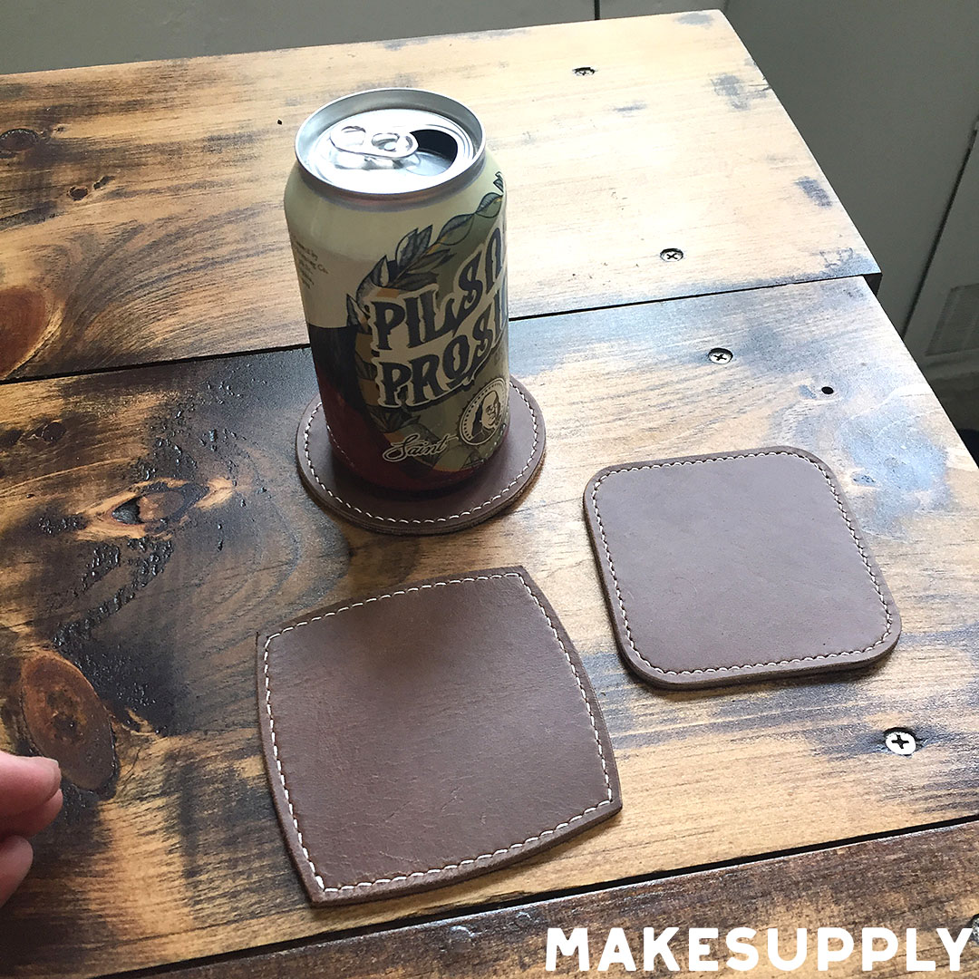 The pattern includes multiple coaster shapes, making it easy to experiment with different styles or create matching sets. These leather drink coasters are sized for everyday cups and cans and can be customized with stitching, edge finishing, or stamped designs.