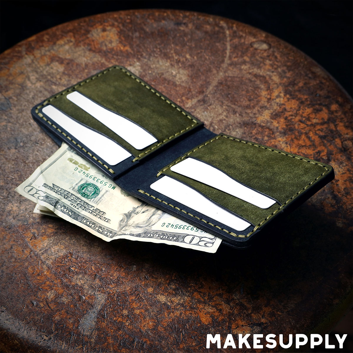 In the photo examples we used 3/3.5oz (1.2mm – 1.4mm) thick navy and olive Pueblo Leather. This wallet can be made from many different types of leather but we recommend keeping the thickness down because there are multiple layers stacked on top of each other. Skiving your edges and t-slots are very important to keeping a slim and sleek final product.